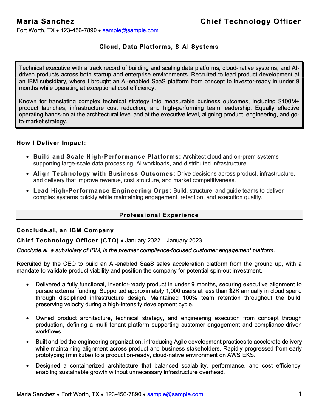 And yet, the resume didn’t reflect that level of impact. It read like a strong technical operator: someone highly capable, but not clearly positioned as a technical executive driving business outcomes.